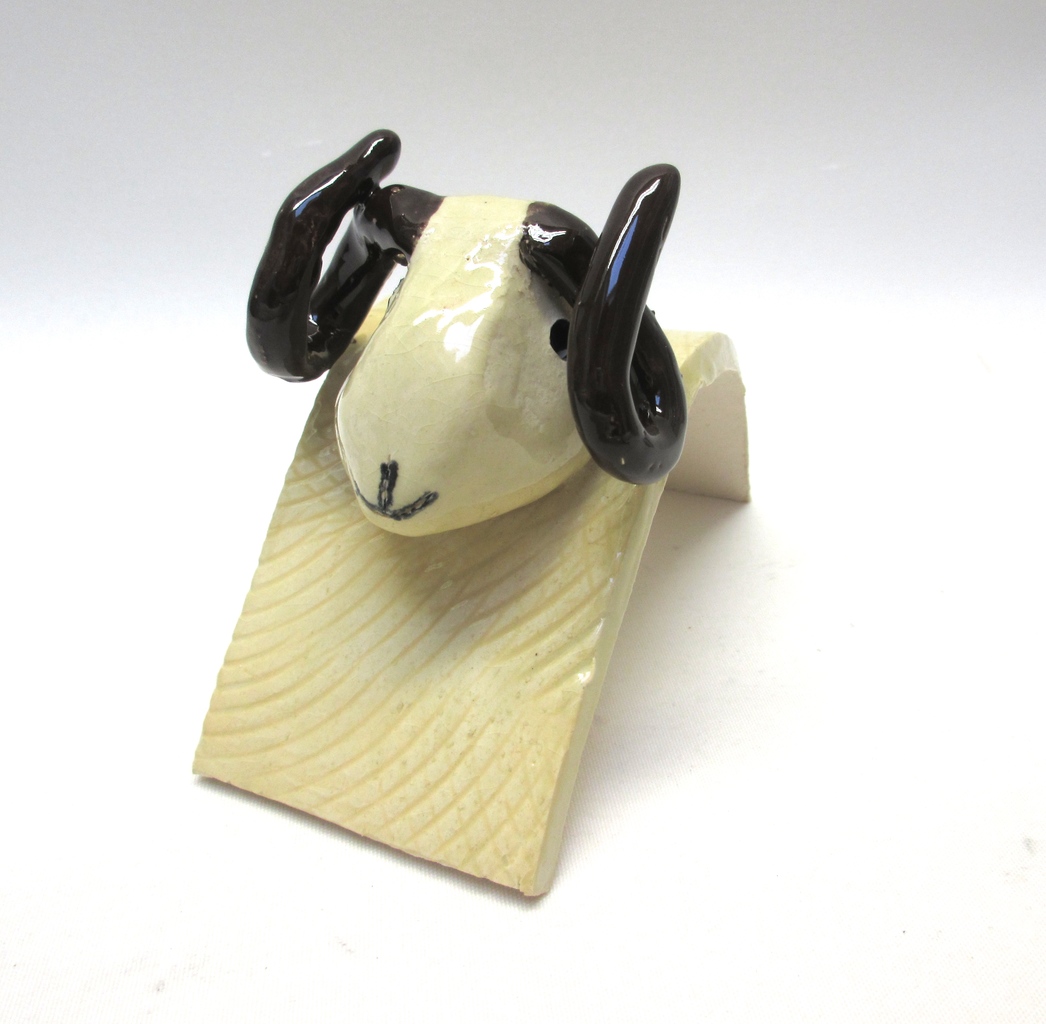 Ram van keramiek. Uniek in zijn soort. Ik heb er in totaal vijf gemaakt, maar omdat het handwerk is, is er geen ram gelijk. Op de site staan er nu 2, de andere 3 komen binnenkort in een expositie te staan. Heb je interesse in meerdere rammen, dan kun je uiteraard even contact met mij opnemen. De maten zijn: hoog 9cm diep13cm en breed 7cm.
