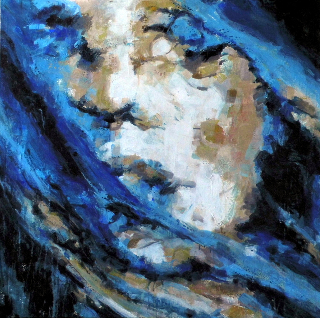 portret verzonken in golvende haren Carla van Lieshout .abstract expressionistische portretkunst. Het combineert een figuratieve weergave van een gezicht met abstracte, expressieve penseelstreken en een nadruk op kleur en textuur. bedoeld om emotie en sfeer uit te drukken, eerder dan realistische details weer te geven
