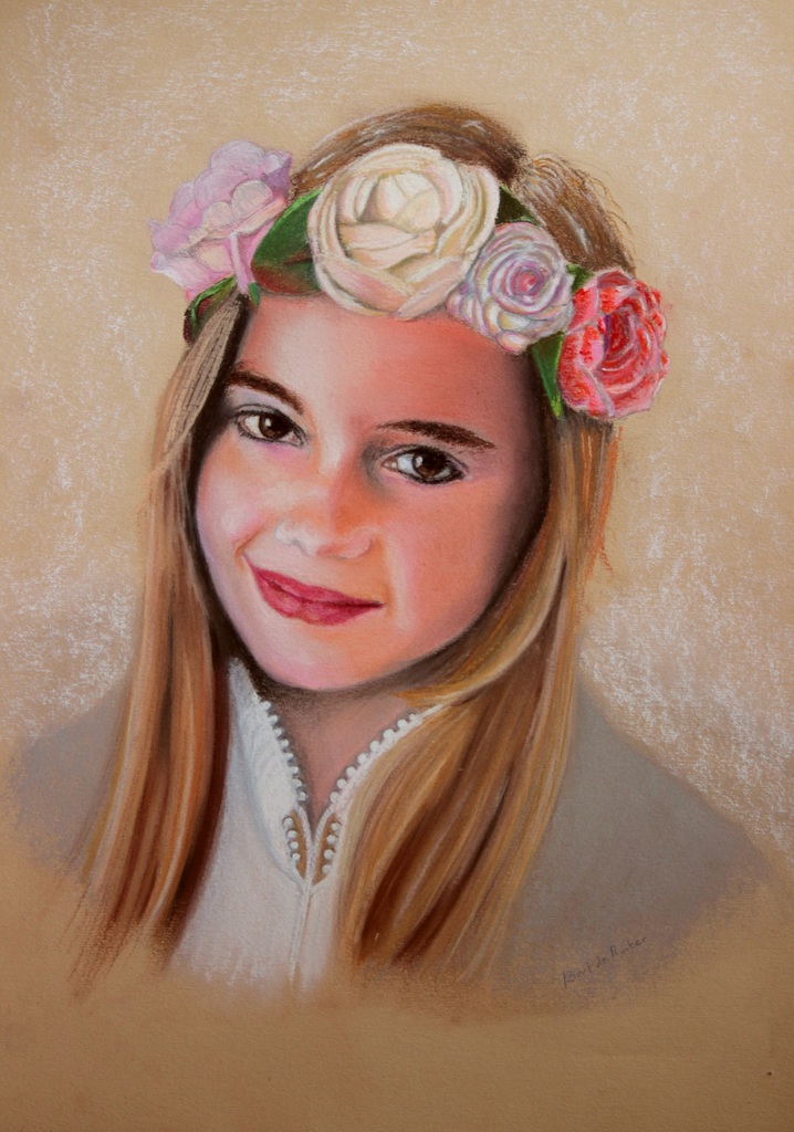 Fleurig portret van mijn kleinkind Noor met bloemenkrans gemaakt met pastelkrijt, houtskool en potlood.