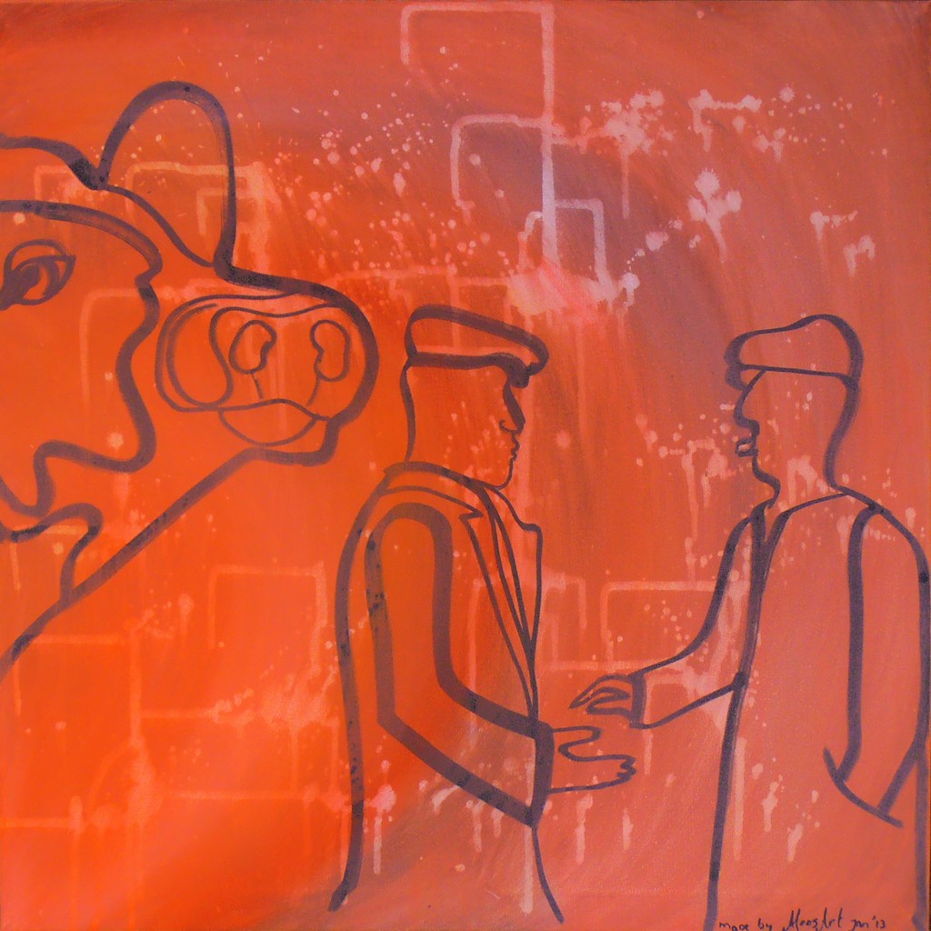 Twee boeren die dmv het ouderwetse 'handje klap' een koe proberen te verhandelen.