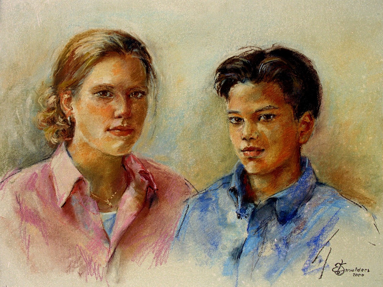 Frederike en Justin, naar model, pastelkrijt op mi-teinte papier.