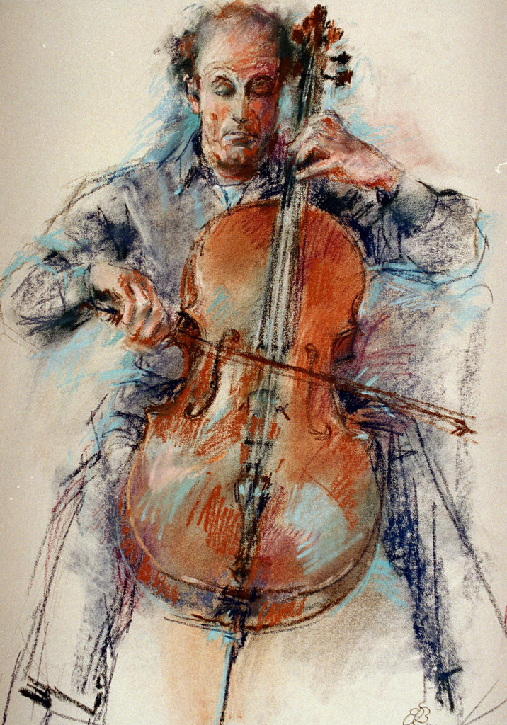 Theo van de Loo met zijn cello, naar model. Pastelkrijt op mi - teinte board.