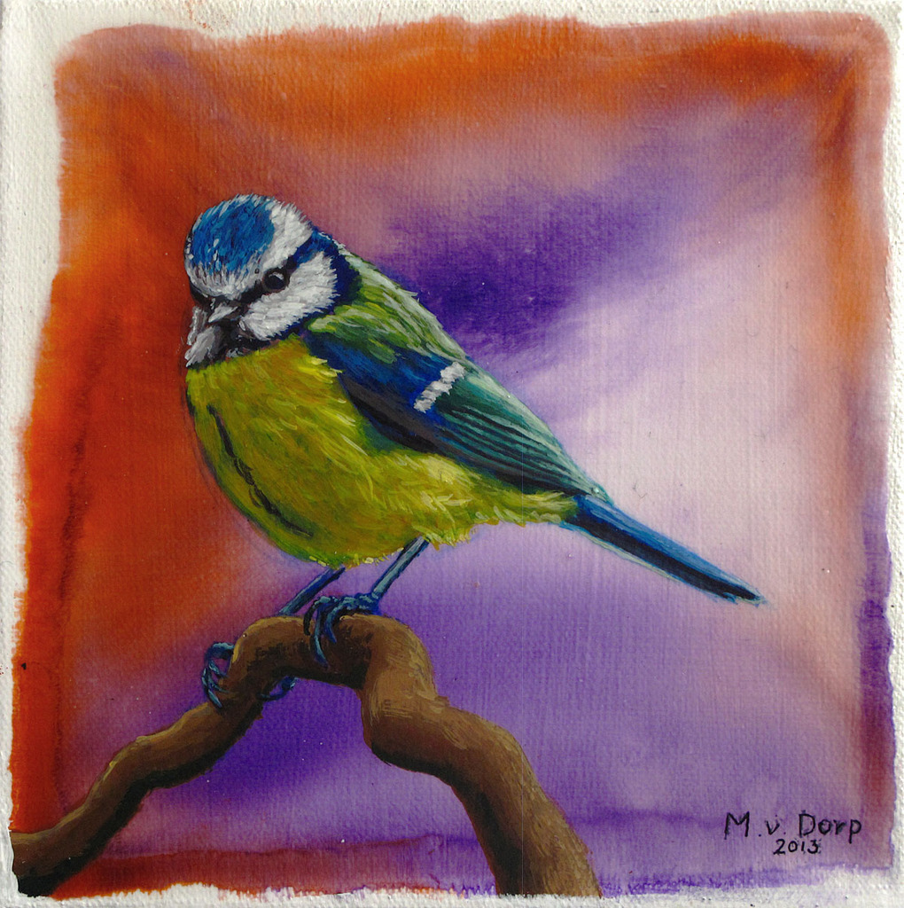 Het pimpelmeesje is de eerste uit een reeks vogelportretjes. Het is mijn mascotte en niet te koop. Al mijn andere vogelportretjes zijn wél te koop, maar ik verkkop hem wel als ansichtkaart. Details vind je onder het kopje 'kunstkaarten'.
