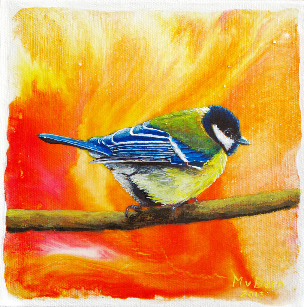 Realistisch Acrylverf Schilderijtje Koolmees Vogeltje Tuinvogel