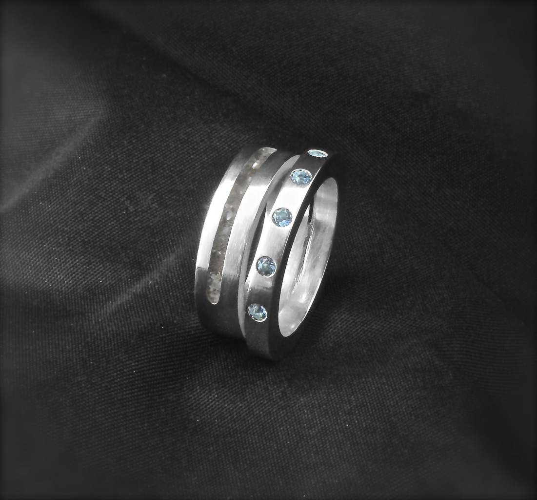 Zilveren Damesring met 5x Aquamarijnen en een zichtbare as-bestemming Hoi Margriet, Je had gelijk hoor... ik zit er de hele middag al naar te kijken! Ben er super blij mee, hij is echt prachtig geworden. Ik vond het super om zelf het as te kunnen plaatsen en op deze manier mijn kleine mannetje altijd bij me te hebben. Bedankt! Ik vond het erg mooi om deze ring samen met jou te ontwerpen en draag hem dan ook met heel veel trots!