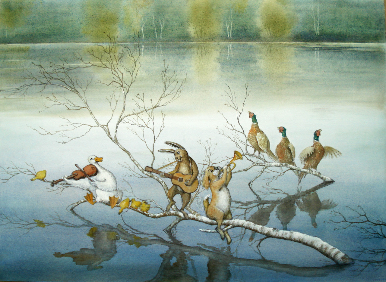 Landschap Water Aquarel Bomen Hond Leuk Fun Sprookje Muziek Konijn Humor Eend Kuikens Fazant Glimlach Schilderij Natuur Berk