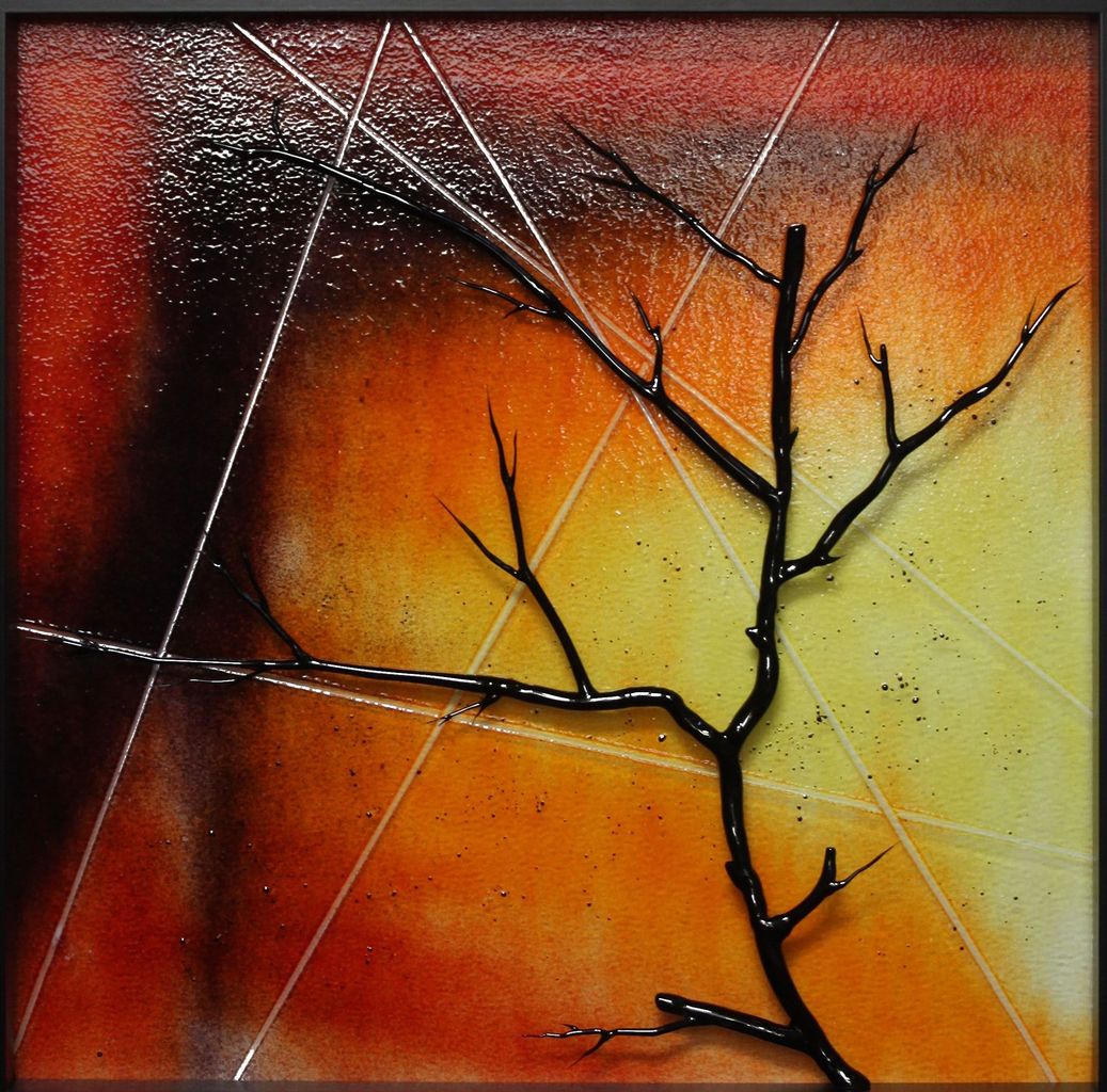 De achterwand van het schilderij is van glas en gemaakt door Ellen Prinse. De 3 dimensionale tak is gemaakt aan de brander van glas met zogenaamde flameworking techniek. Serie van 3 panelen.