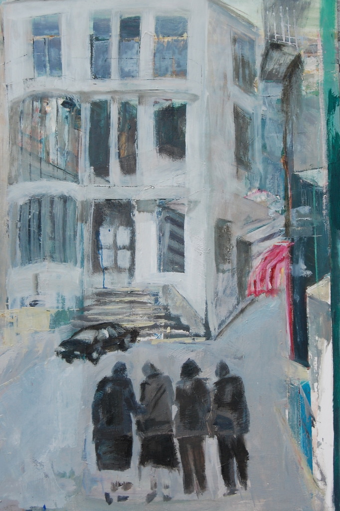 Mijn naam is Catherine Noë. Zo'n 10 jaar geleden ben ik begonnen met schilderen. Ik schilder wat me raakt, op de meeste doeken komen mensen voor of straatbeelden. Ze wekken bij mij nieuwsgierigheid op, wat is er allemaal gebeurd in deze straat, wie is deze persoon, waar gaat hij naar toe, heeft hij een gezin, een spannend leven, een geliefde...? Los van het beeld vind ik kleurgebruik belangrijk, ik doe dat intuïtief daarmee creëer ik een meer sprekend doek.