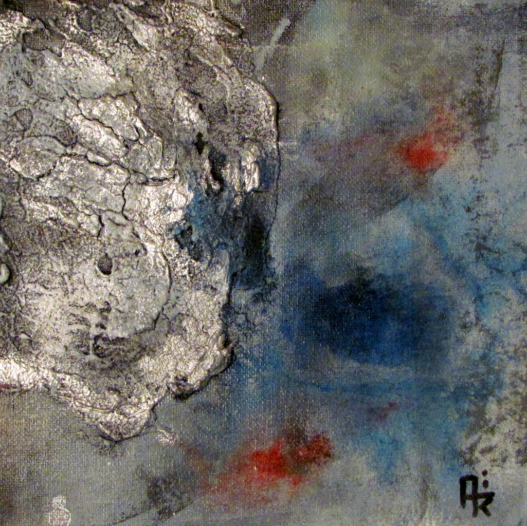 mini, no.4 van 4 materieschilderijtjes, mixed media zilverkleurige lijst