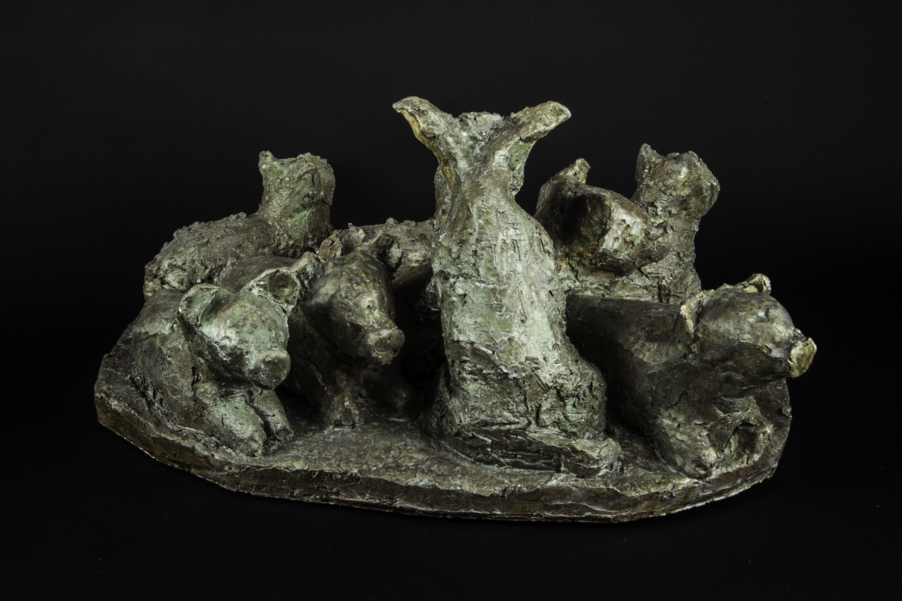 De Kudde 4 varkens, 3 schapen en een geit...., op de boerderij of gewoon bij een hobby boer thuis Gezellig bij elkaar liggend Gemaakt van grove chamotte klei en na een droogperiode afgebakken op 1000 graden Laag na laag in bronskleur gebracht Daardoor nu ook geschikt om behalve binnen nu ook buiten te plaatsen