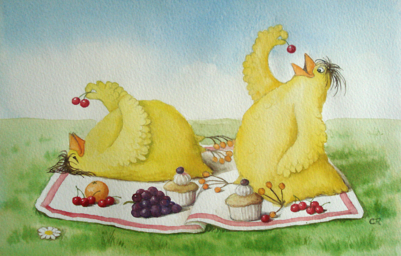 Fruit Feest Dieren Aquarel Eten Leuk Plezier Sprookje Kip Kippen Illustratie Humor Kersen Druiven Taartjes Cupcake Kijkentjes Schilderijtje