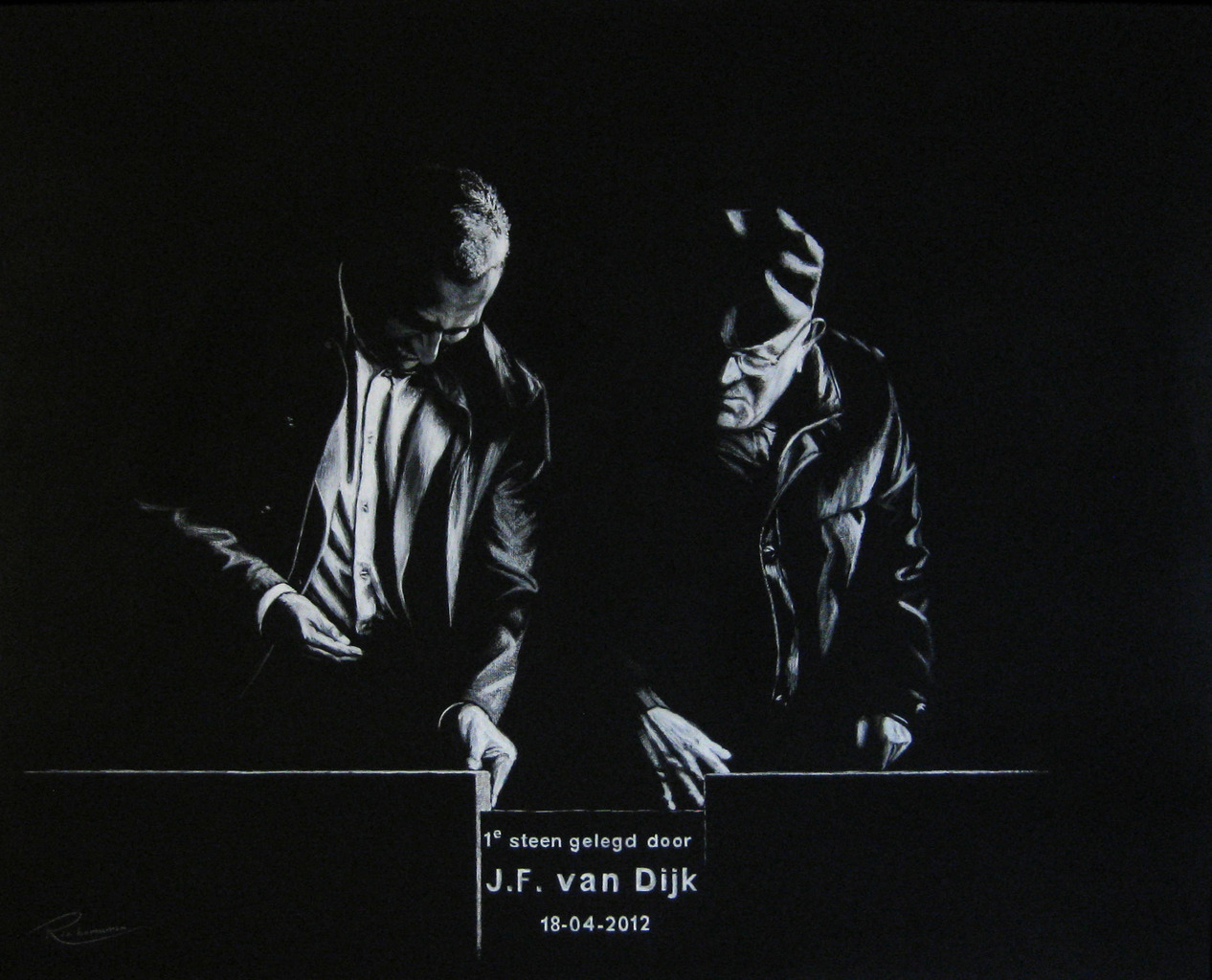 Vakmanschap - overgedragen van vader op zoon,symbolisch vorm gekregen in de eerste steenlegging door de vader. (In opdracht van Van Dijk Technologie, ter gelegenheid van de opening van het nieuwe bedrijfspand )