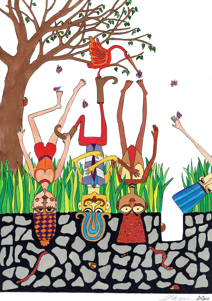 Natuur Gouache Bomen Gras Fun Personen Kleur Tree Grass Cultuur People Humor Verhaal Culture Nature Story Illustratief Illustration
