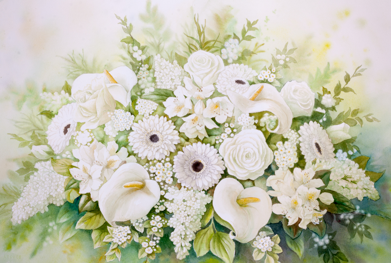 Aquarel Witte Bloesem Blank Seringen Gerberas Arondskelken Schilderij Natuur