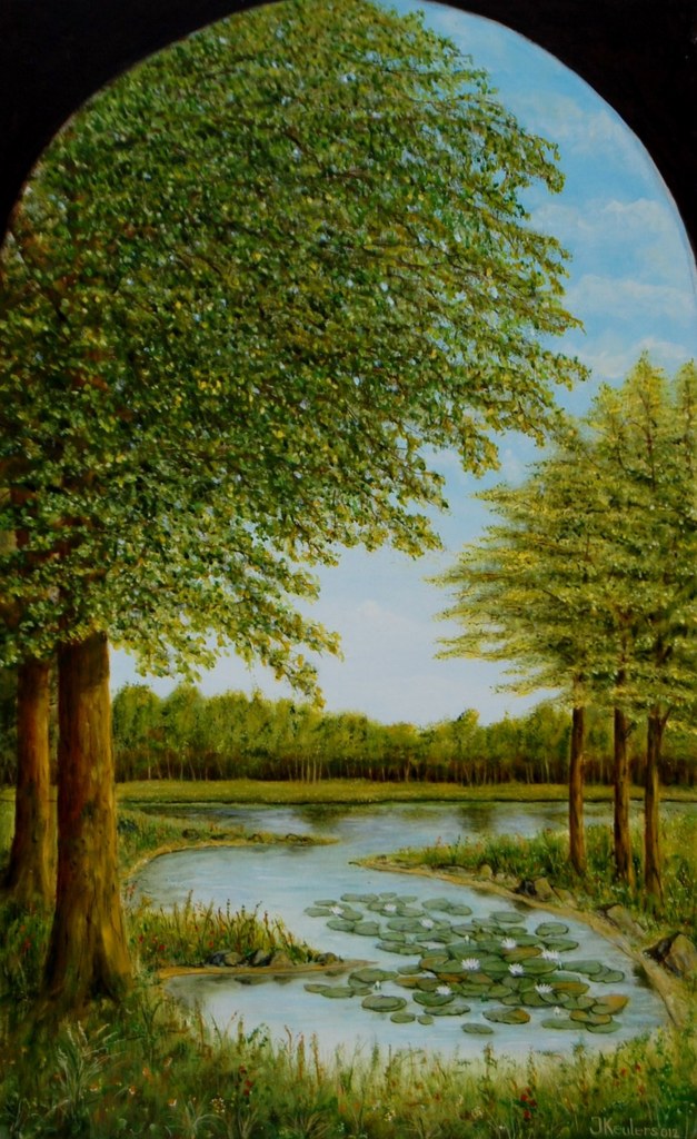 Een verzonnen landschap voor een tuinposter die word afgedrukt op zeil. Bestaande omlijsting is halfrond en meet 90x146 cm het paneel is op halve grote.