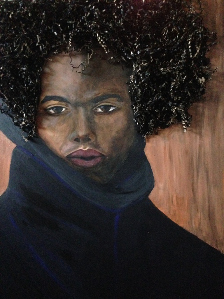 Geschilderd met acrylverf en het zwart gespoten haar is van krulkarton gemaakt.