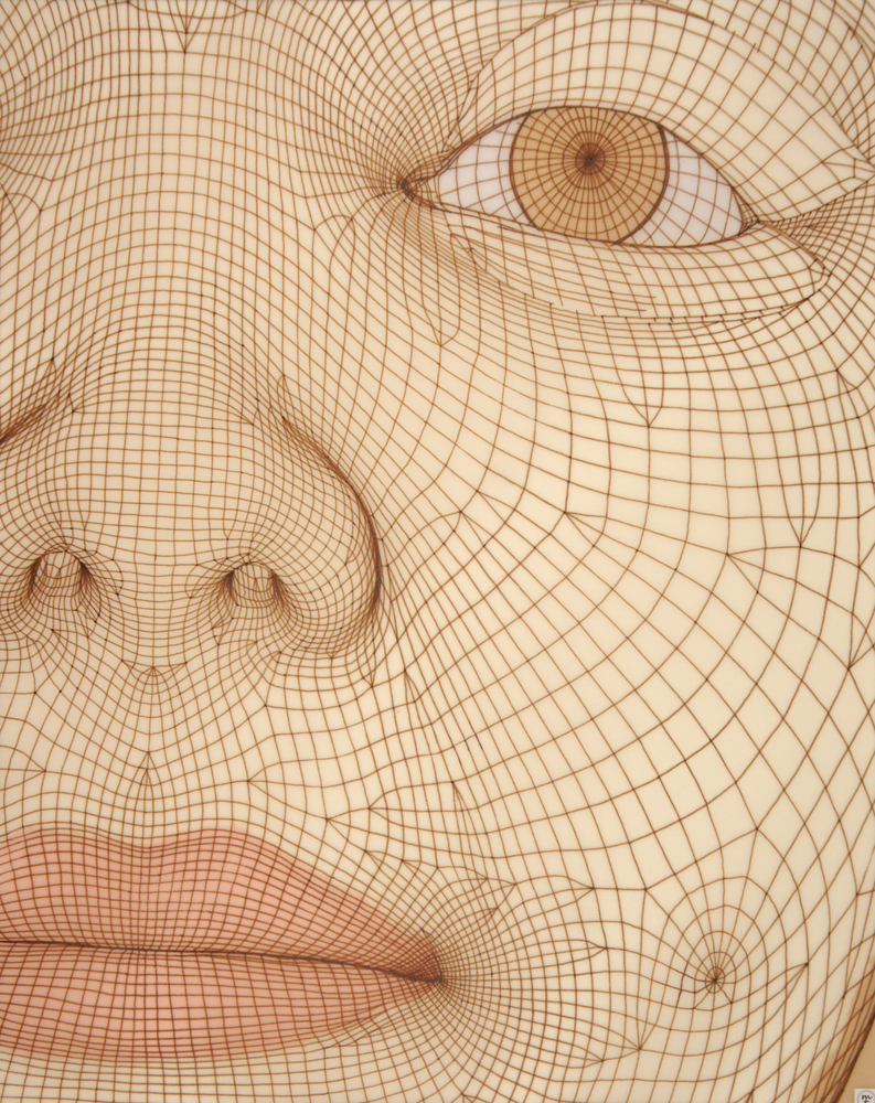 Detail van een gezicht (in de fabricage van werkelijkheid serie) inkttekening en papier collage.