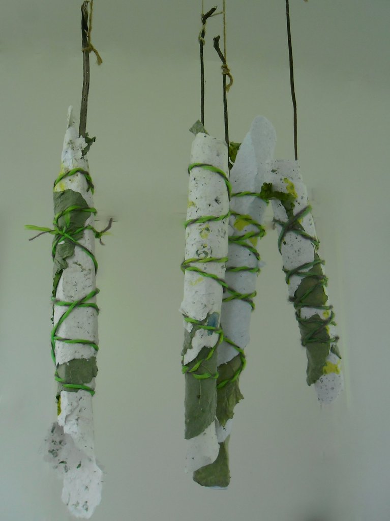 'Verborgen berichten' is een ruimtelijk werk in het project Artist in residence Werk aan het Spoel juli 2012 Beschreven gegoten papier gerold in blad van de Arctium lappa.