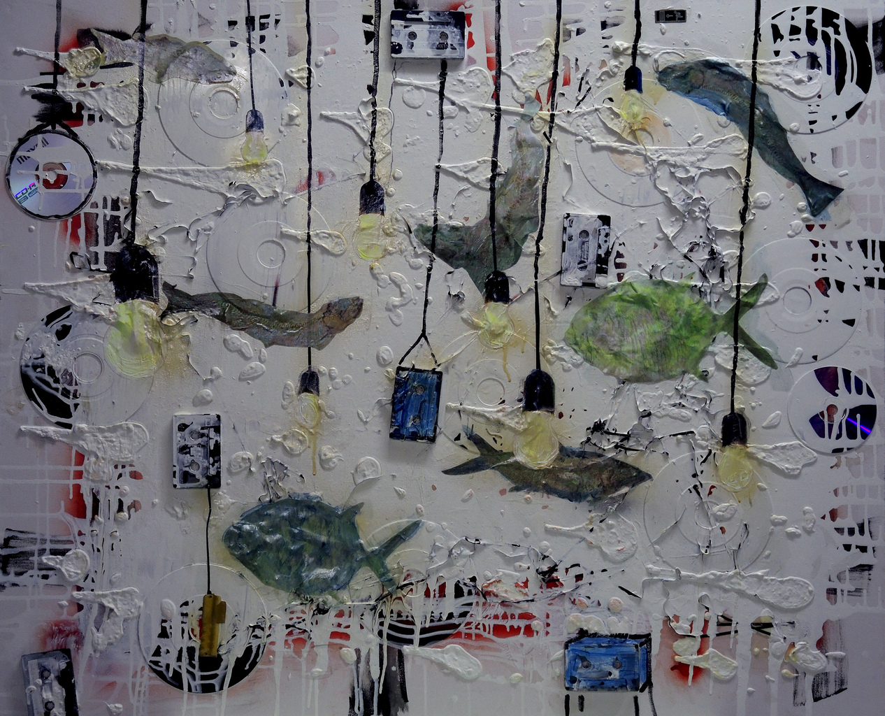 Schilderij Wit Surreeel Abstract Acryl Vissen Henk Lampen Snoek Fossielen Gloeilampen Cassettebandjes Cd-schijfjes Henksnelle Volendam