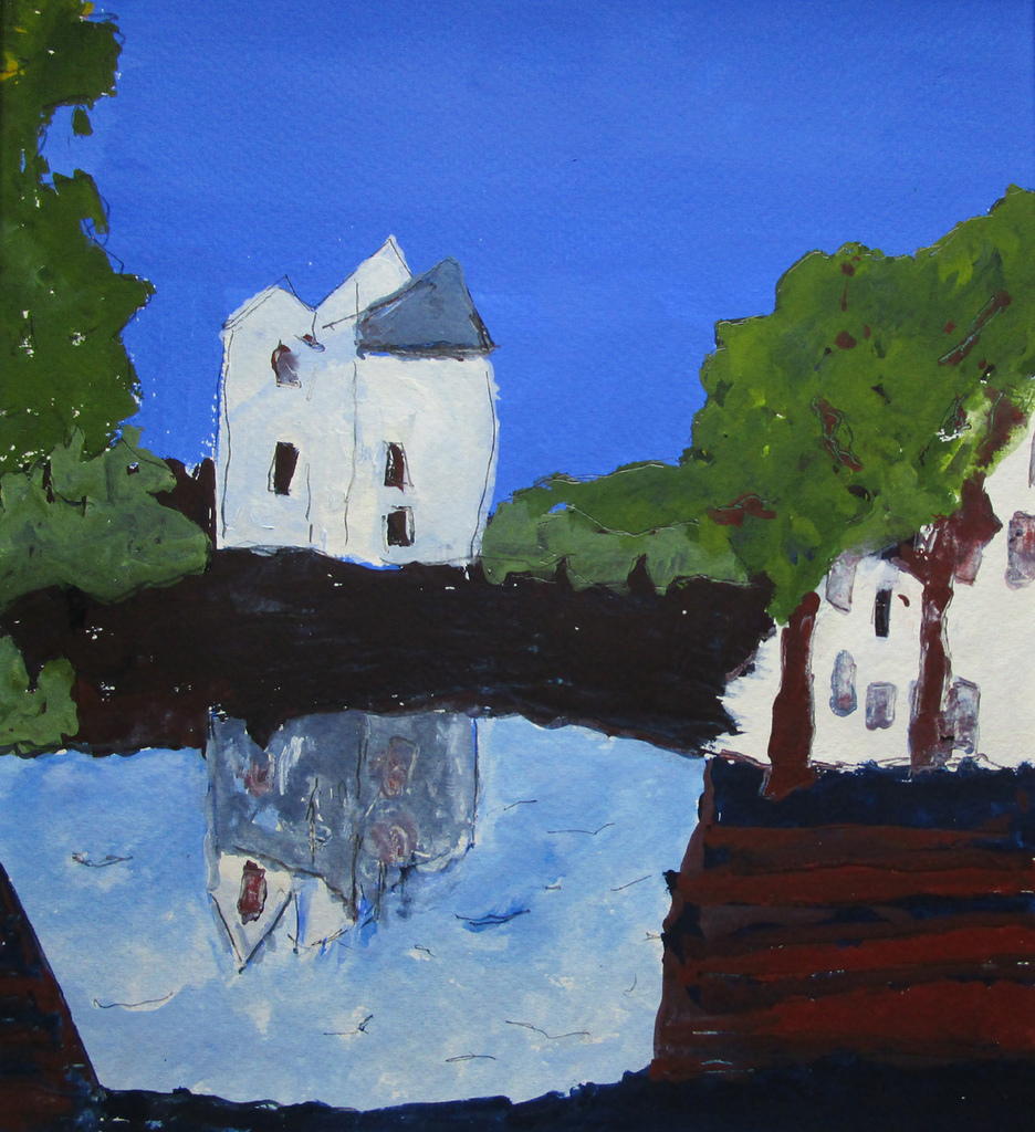 Weerspiegeling Huizen Wit Surreeel Blauw Bruin Water Bomen Lucht