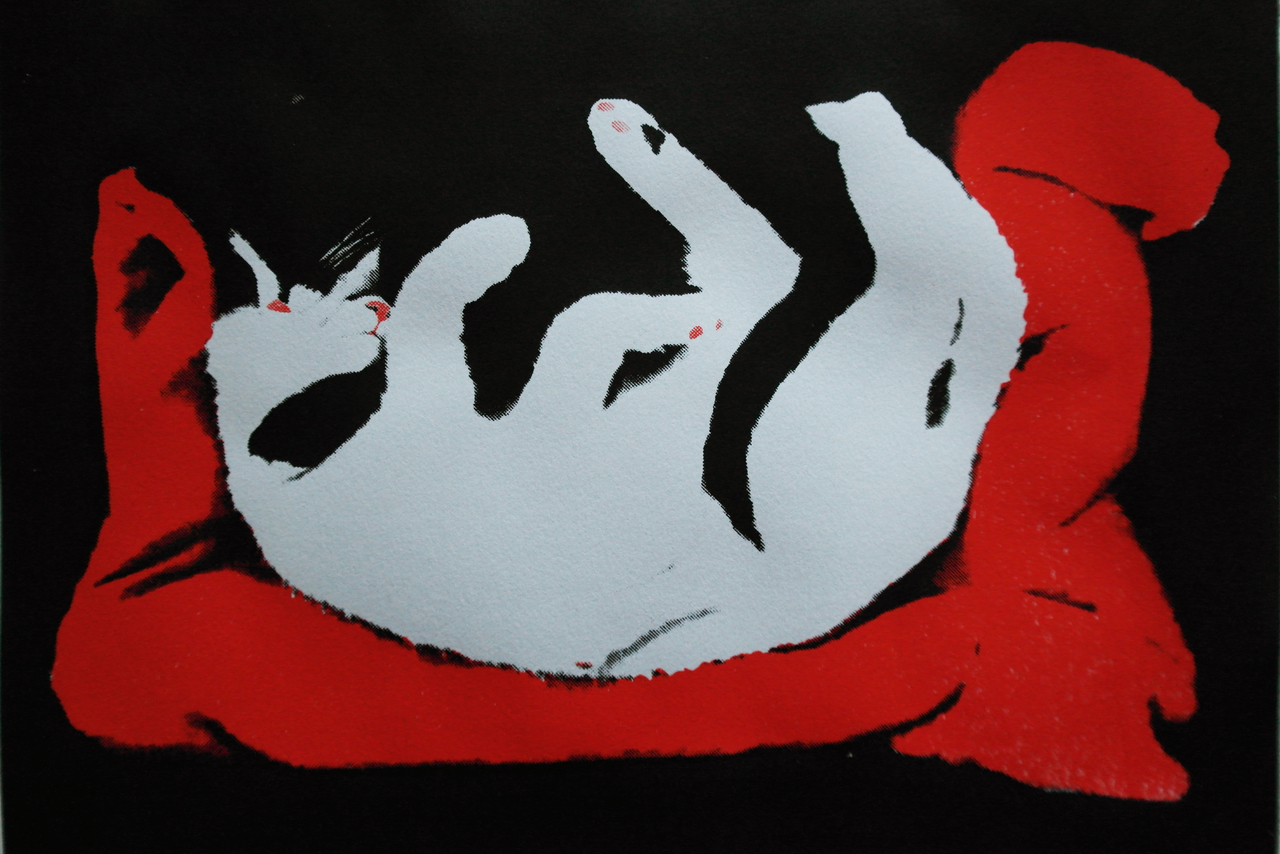 Witte en zwarte kat innig verstrengeld op rood kussen.