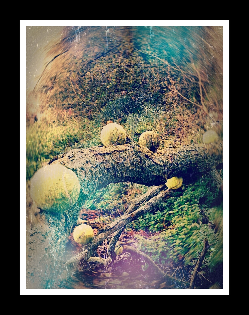 Hoe ziet geluid eruit? Landart met tennisballen. Een stilleven in de natuur. Het witte en zwarte kader zijn onderdeel van het digital artwork, om te laten zien dat het geluid 'gevangen is in beeld'.