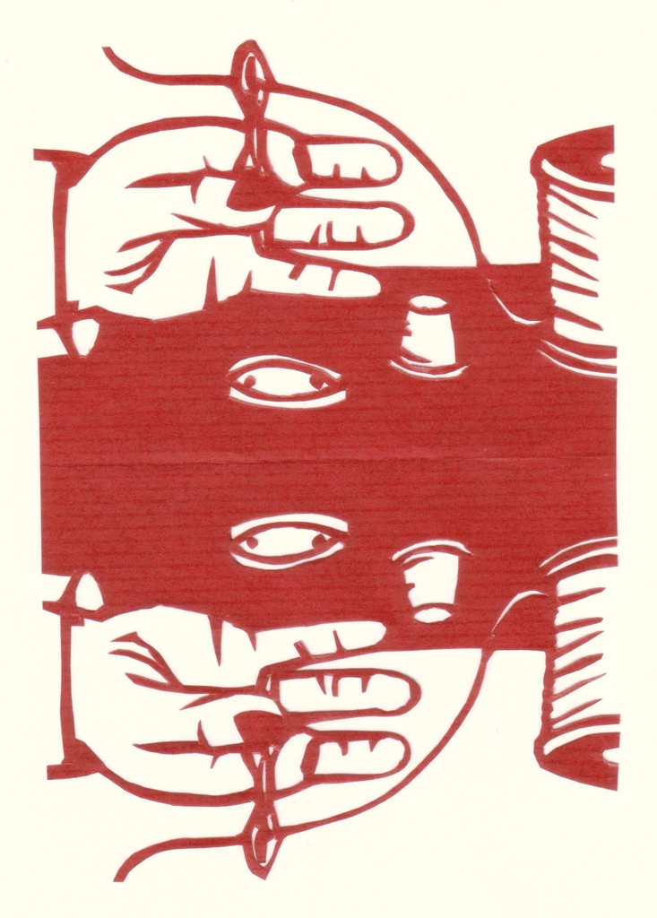 Knoopje Overhemd Naald Draad Garen Klosje Vingerhoed Papier Rood Knipkunst Knipwerk Scherenschnitt Paper Cut
