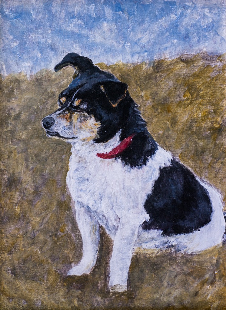 Schilderij van oude hond, zit braaf te wachten op zijn baasje. Dieren geschilderd.