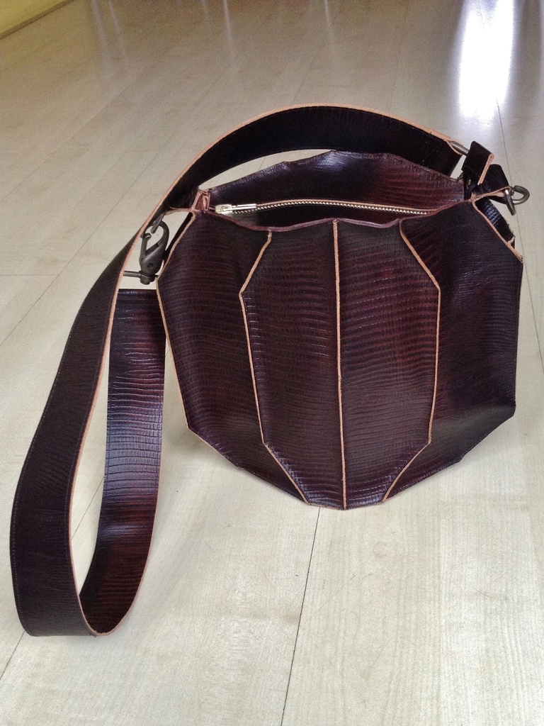Tas van bruin rundleer met goudkleurige satijnen voering. Klik op de foto voor de prijs.