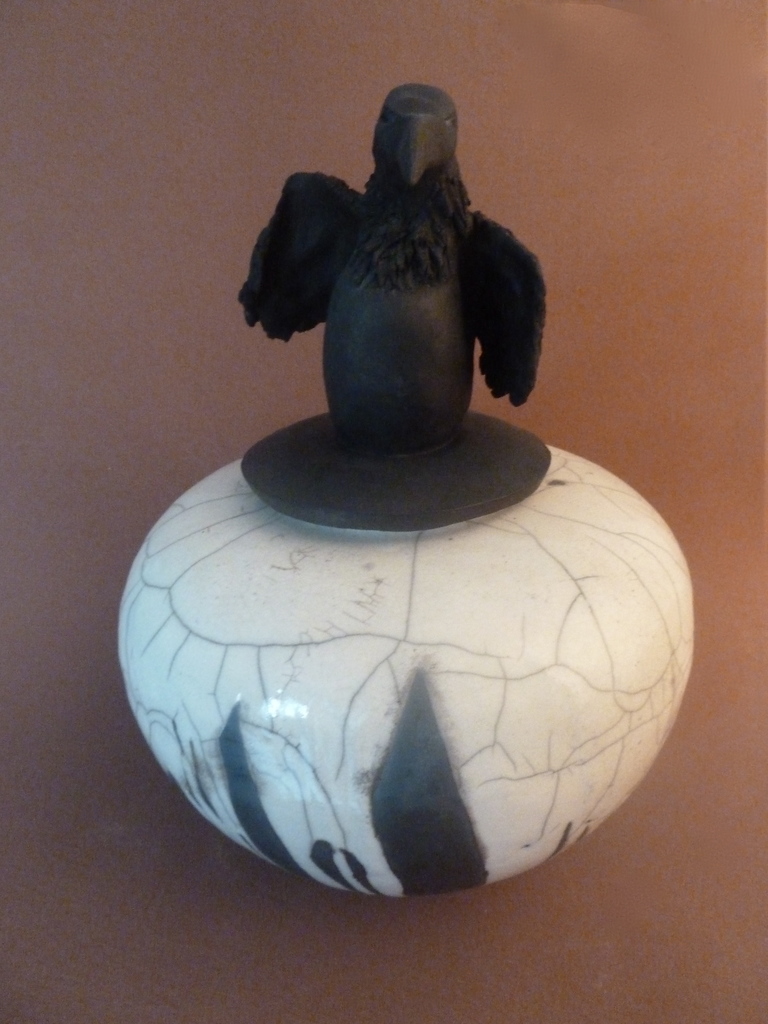 Zwartwit raku gestookte pot met als deksel een zwarte raaf.