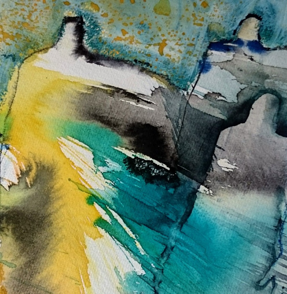 Een aquarel met gemengde techniek(inkt en vetkrijt) van drie figuren , De kleuren zijn geel blauw en turquoois. Wordt verzonden met lijst en passepartout