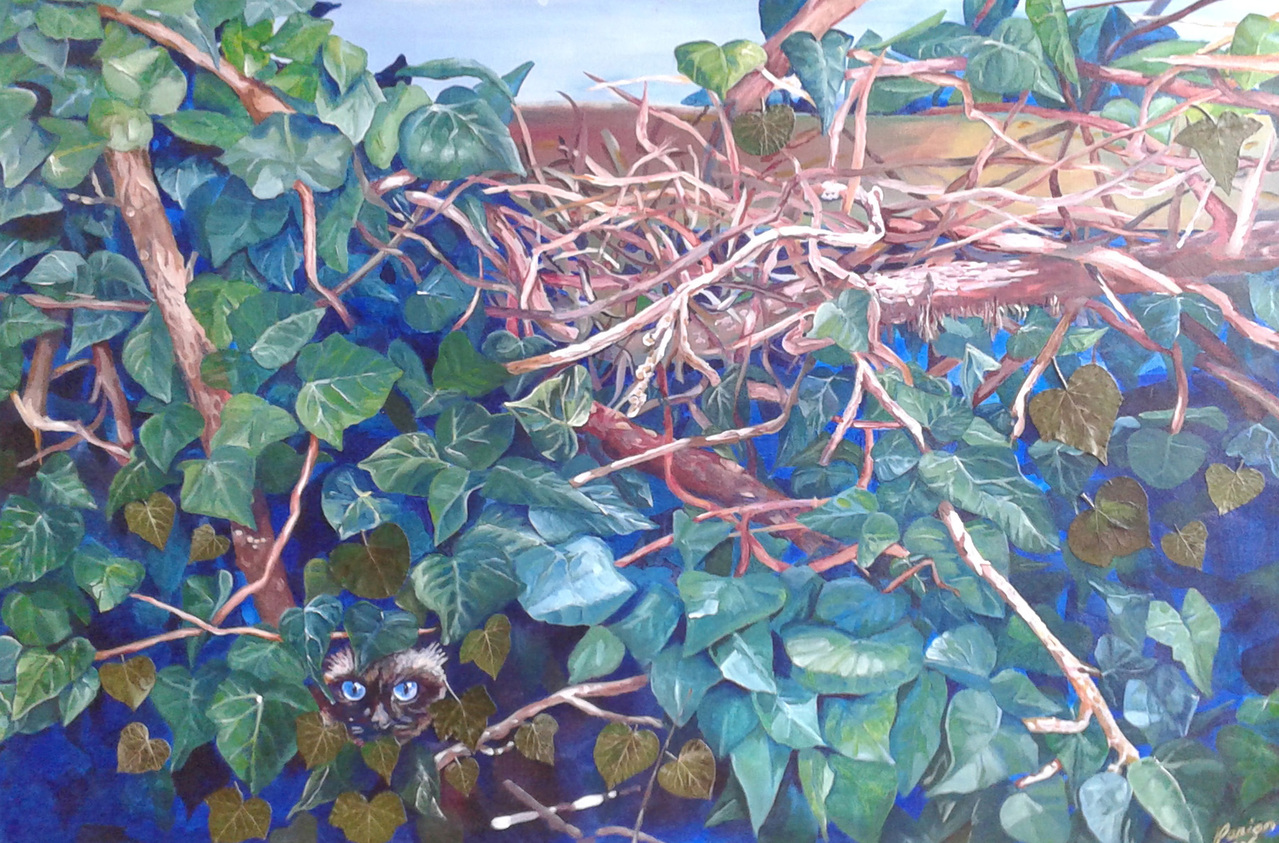Rigoreus gesnoeid, een beetje teveel. Om het toch wat spannend te houden kijkt mijn lievelings huisdier ondeugend tussen bladeren door.