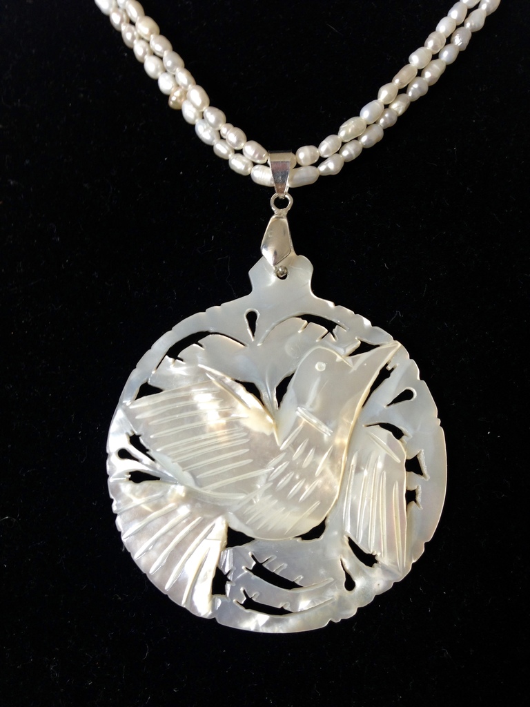 Prachtige hanger van Parelmoer. De kralen zijn echte zoetwaterpareltjes.