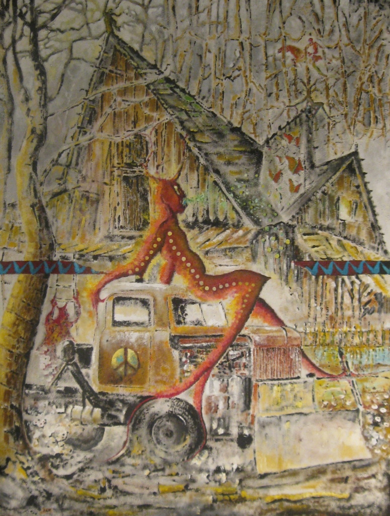 Schaduwrijk boslandschap met vervallen boshut en idem truck wordt beheerst door allerhande bosbewoners waarvan de grootste een stroom vlinders en bloemen uitspuwt.