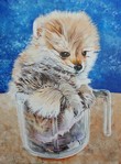 Niets is zo verandelijk als het weer en de natuur, wie kan zich aanpssen aan een omgeving? Een kameleon, als je het dier al kan vinden, blijk het echt wonderbaarlijk te zien dat de huid zo is opgebouwd dat het van kleur kan veranderen, het neemt de kleur aan van de omgeving. Prachtige creatie van de natuur. Het oog komt zo het doek uit en kan vrijwijl alle kanten op zien. De achtergrond is groenig opgezet en de kameleon zelf van een egale ondergrond verder met stipjes verf opgezet en gevormd.