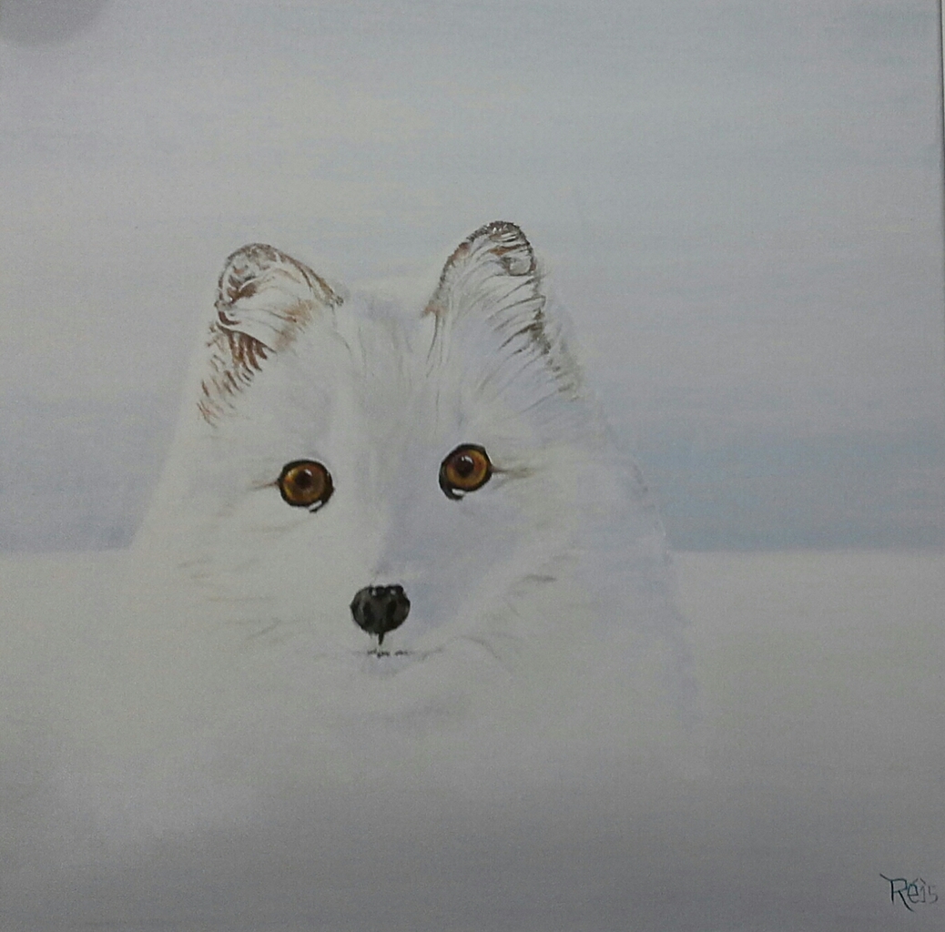 Hoe koud het ook is, zeer lichtgrijze achtergrond wat naar wit verlopend verschijnd daar een poolvosje wat gaat zitten staren over de poolvlakte. Kijkend alle richtingen op tuurd het deze richting op inzoemend is er een mooi prachtig kopje te zien, wij rillen van de kou deze poolvos zoekend naar een prooi om zo de barmhartige koude gebieden te kunnen overleven.