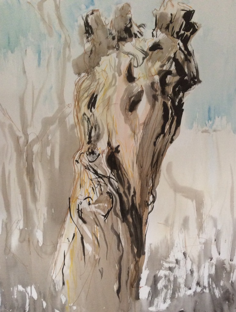 Oude knotwilg geschilderd op doek met inkt, bister en aquarel