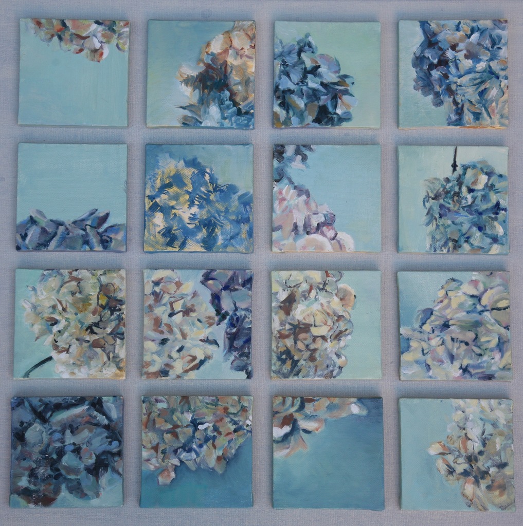 Fragmenten van een hortensia in een collage bijeen gebracht laten de prachtige kleuren nog beter uitkomen