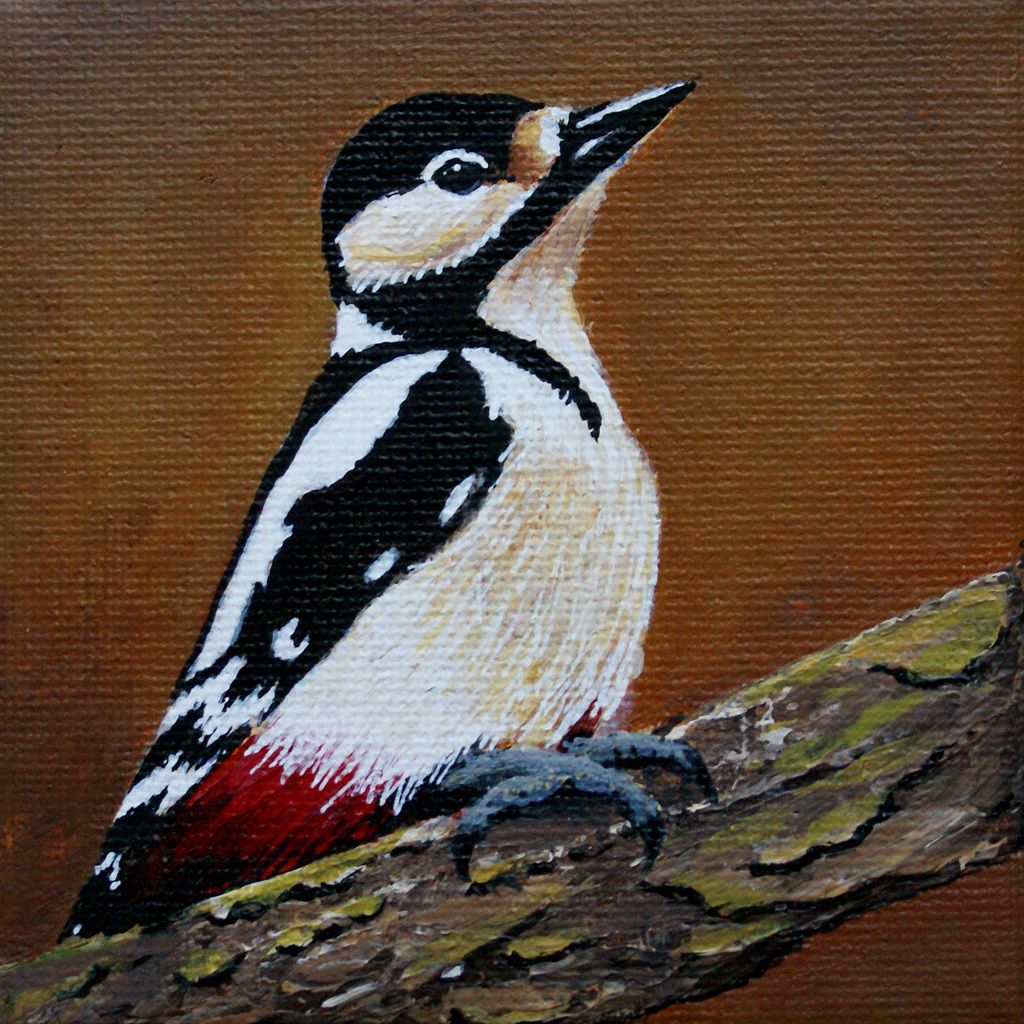 Schilderij Acryl Vogel Wildlife Painting Acrylic Bird Specht Miniatuur Woodpecker Miniature