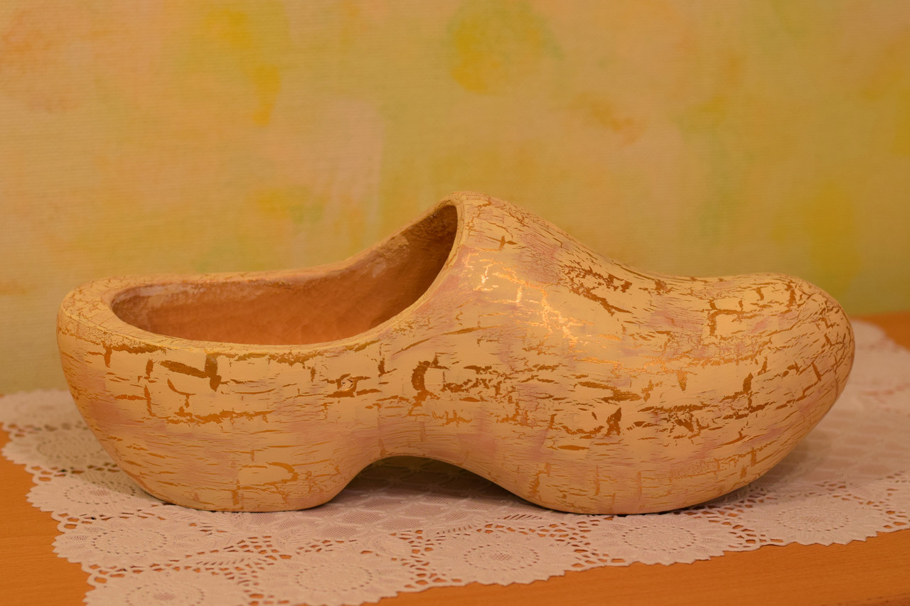 Decoratieve houten klomp, handgeschilderd met acryl op op de handgemaakte craquelure en gelakt met glanzend vernis. De lengte is 32 cm. Slechts één stuk gemaakt. Het wordt geleverd met een certificaat van echtheid.