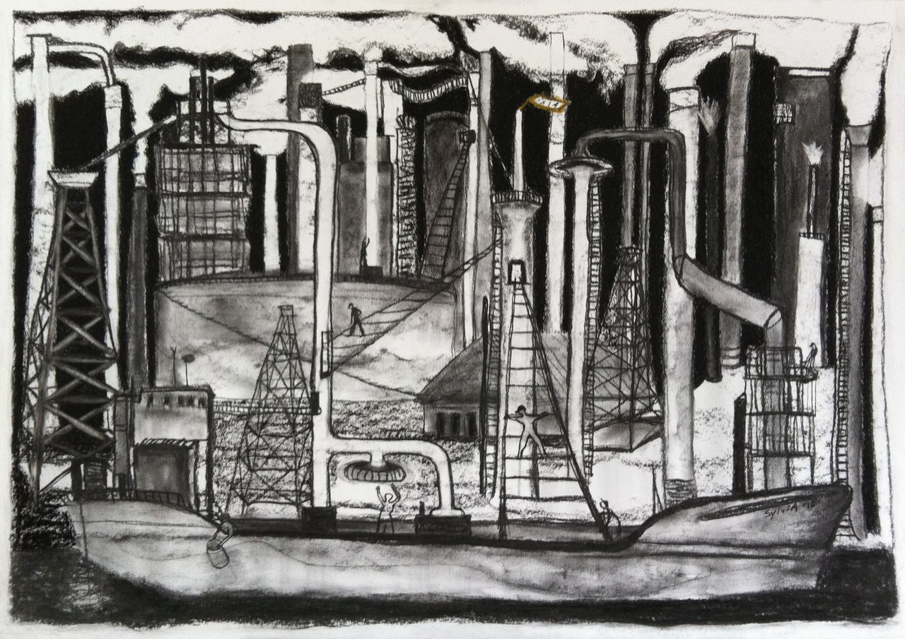Pot Oil Hot Eten Restaurant Bol Houtskool Snijden Raffinaderij Isla Lino Charcoal Curacao Begraafplaats Joodse Jewish Druktechniek Linoleum Drukpers Cutting Cemetery Refinery Linocutting Printtechniek Olieraffinaderij