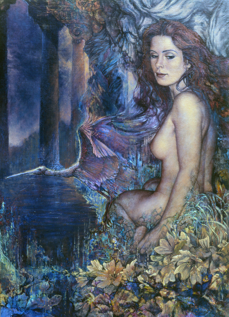 Vrouw Vogel Ibis Water Zuilen Bloemen Draperie Woman Bird Collumns Flowers Nude Naakt Back Abstract Dynamiek Abstractie Fantastisch Realistisch Figuratief Fijnschilder Verftoets Betekenisvol Lading Reliëf