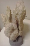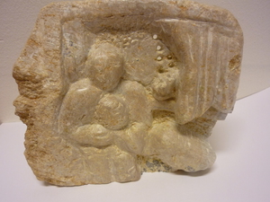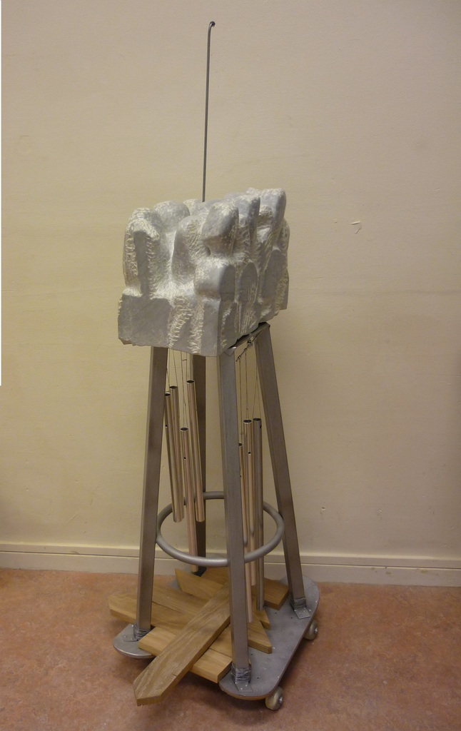Een groep van gezichten - afwisselend in vormen van materie en in leegtes. Op een wankel bouwsel, een toren van hoop en een klein vlot- onderweg zoals de miljoenen migranten die het oorlogsgeweld ontvluchten en een nieuw thuis zoeken. Met een windorgel als symbool voor de stemmen die dit vlot draagt: iedereen heeft een eigen levenslied uit te dragen Grijs marmer op een sokkel van mixed media.