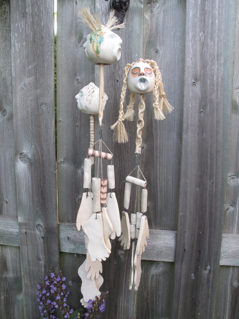 Gegoten vorm gemaakt m.b.v. zelfgemaakte mallen. Samengestelde vorm Gietklei, onderglazuurpotlood, ijzerdraad, touw, belletjes en glazuur er zijn 22 fuguurtjes, kunnen per stuk verkocht worden afmeting is ongeveer en per figuurtje