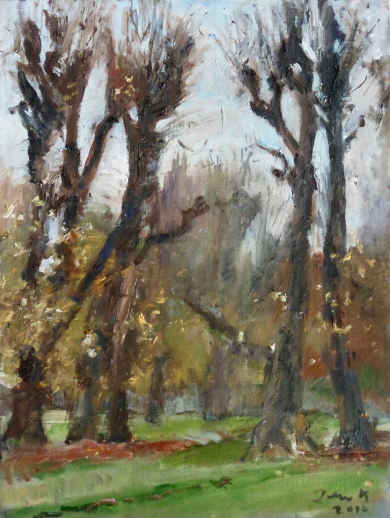 Groep knotlinden in het najaar. bijna kaal, maar hier en daar nog wat gouden bladeren. Prachtig was het met de zon erop!