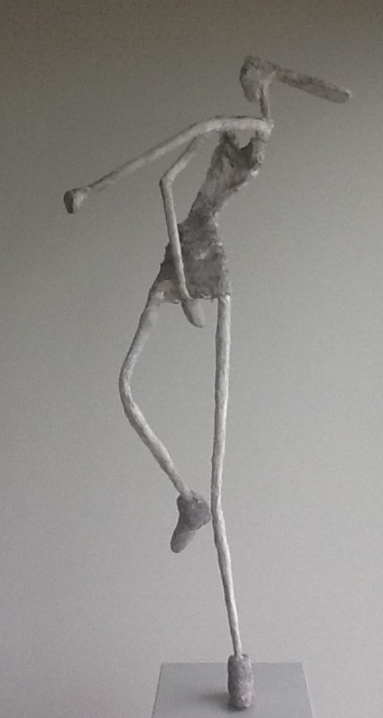 De opdracht was een langgerekt vrouwenfiguur. Ze is gemaakt van staal, polyeurethaan en acrilic one.