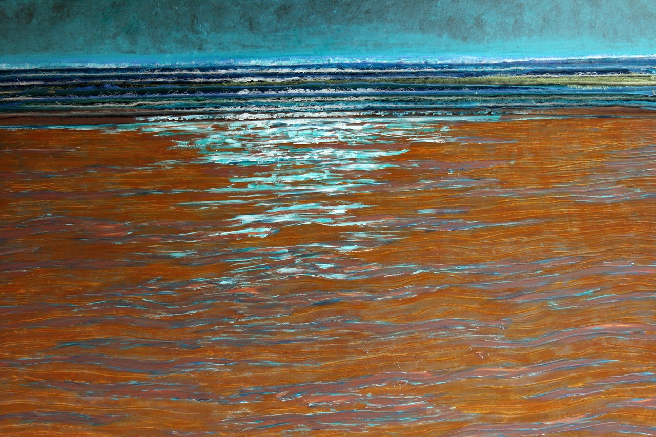 Tijdens een vakantie op een van de eilanden in het noorden van Nederland werd ze getroffen door het weidse vlakke landschap. Dit soort landschap geeft haar een gevoel van vrijheid. Het was een inspiratie om een aantal schilderijen in dit thema te maken. De eenvoud van het onderwerp gaf haar de mogelijkheid om te experimenteren met een verscheidenheid aan materialen. Hierdoor heeft elk schilderij een andere unieke sfeer. Voor dit werk gebruikte ze in de collagetechniek stof, roest en acrylverf. https://www.singulart.com/nl/kunstwerken/gita-kalishoek-tide-receiding-water-890541