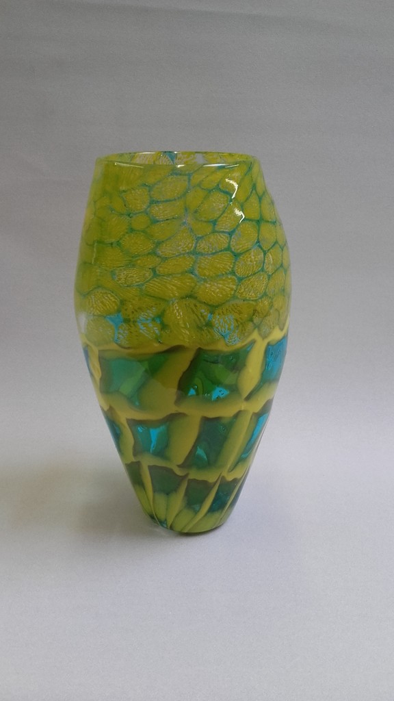 geblazen vaas opgebouwd uit murrini in geel blauw