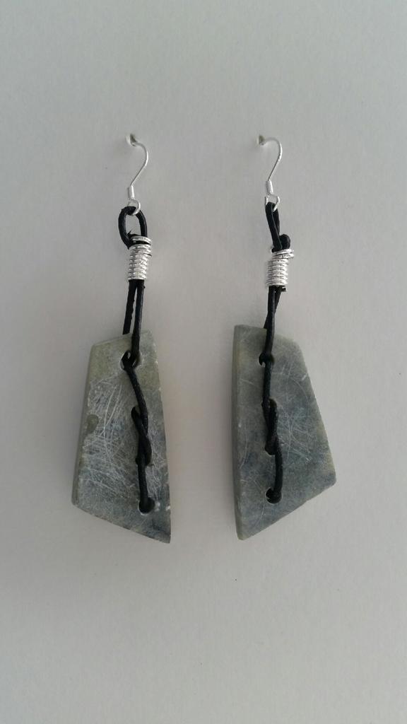 Oorbel van speksteen met leer en afgewerkt met zilver.