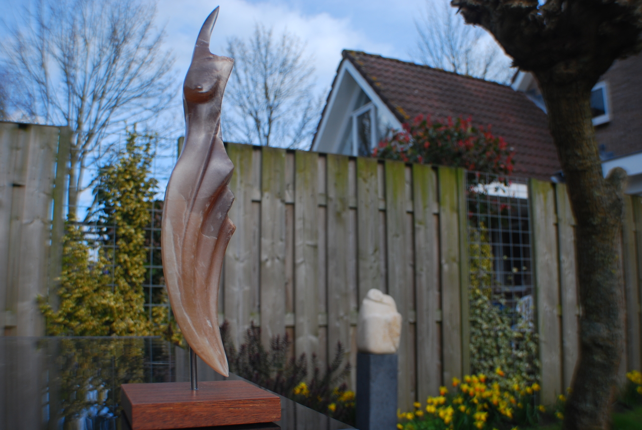 Een geabstraheerd vrouwelijk figuur met één borst. Zelfverzekerd. Positief, ook na grote problemen/tegenslagen (1 borst) Steensoort bruine albast.
